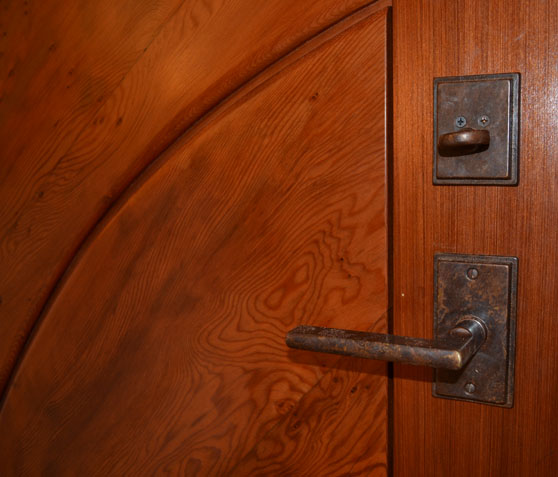 Inspired by calming and meditative themes, the Organic Curves series calls upon simplicity of design as well as specially selected materials. Flat sawn wood creates a wavy effect that emphasizes the flowing nature of these doors. The headliner door of this series, "Spiraling," is easily customizable to the sensibility of the clientthrough selection of window glass, be it hand-blown or architectural sheet glass.